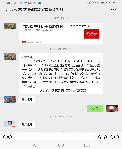 4月30日,人文公司教工党支部采用企业微信的形式召开了以“团结一心,共克时艰”为主题的党员大会。此次会议由人文公司教工党支部书记徐芳主持。