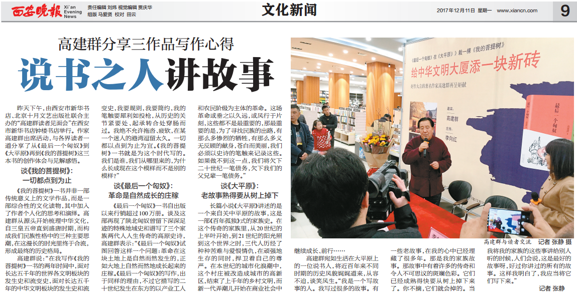 编者按:12月10日上午,由西安市新华书店、北京十月文艺出版社联合主办的“高建群读者见面会”在西安市新华书店钟楼书店举行。人文公司经理、著名作家高建群出席活动,与各界读者一道分享了从《最后一个匈奴》到《大平原》再到《我的菩提树》这三本书的创作体会与见解感悟。活动受到各地文学爱好者的热捧,现场反响热烈。《西安晚报》、西部新闻网、凤凰网、网易等多家媒体对该活动进行了报道和转载,现将全文转载如下: