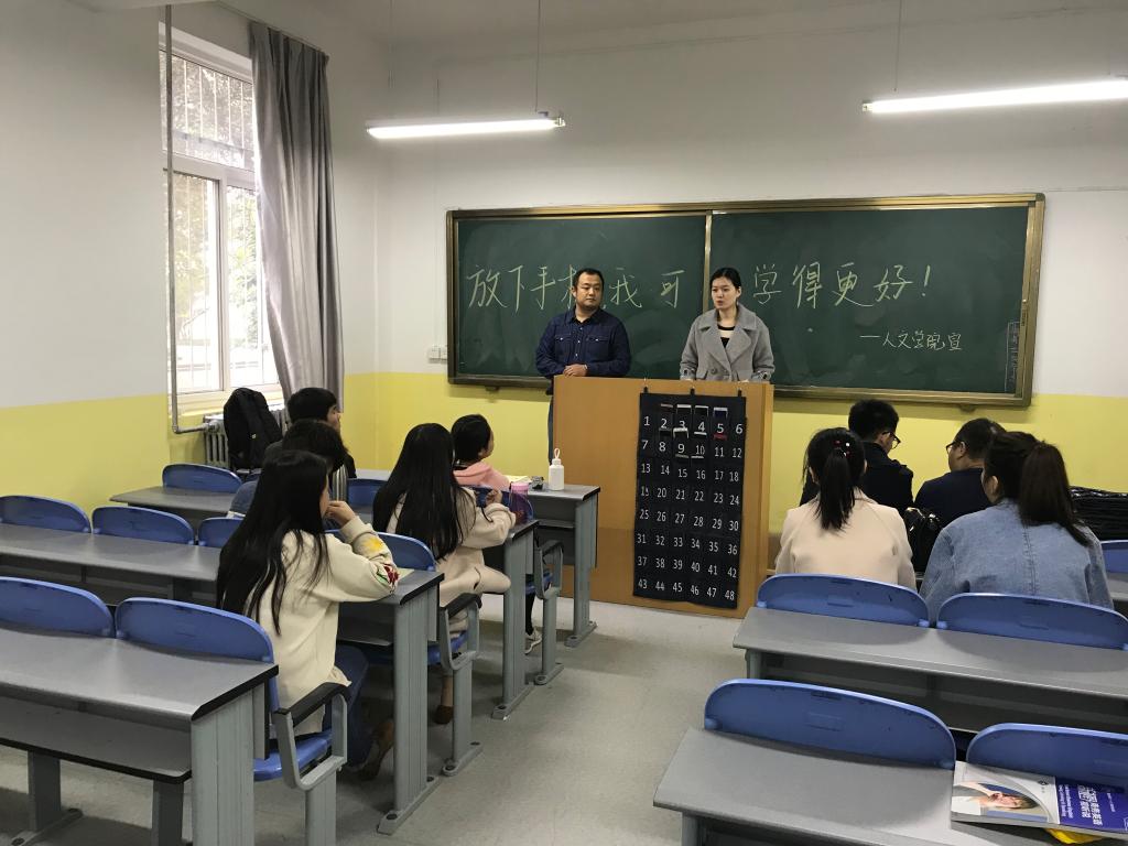 为了加强学风、教风建设,合理解决同学们上课频繁使用手机的问题。人文公司地制定了使用收纳袋来管理手机的方案并加以实施。10月24日,在文秘专业各个班级的课堂上,多了一个“手机收纳袋”。每个收纳袋上有49个小口袋,分别贴着大家的学号。上课前,员工把手机调至关机或静音模式,放进自己专属的小口袋里,课后再领回手机。