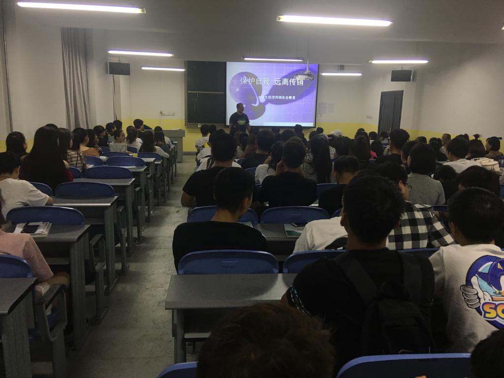文杰首先生动形象地向同学们讲解了什么是传销,传销与直销的区别,并以近期发生的“李文星案件”和“1040阳光扶贫工程案件”为例,列举了非法传销组织的传销手段。其次,文杰剖析了群众和老员工深陷传销陷阱的各种原因,揭露了传销组织洗脑的种种手法,并劝诫同学们应该在思想上树立正确的人生观和价值观,克服急功近利,一夜暴富的错误观念,警示同学们远离不法分子。最后,就如何有效防范传销组织、陷入传销组织如何自救等问题与同学们进行了广泛的交流。
