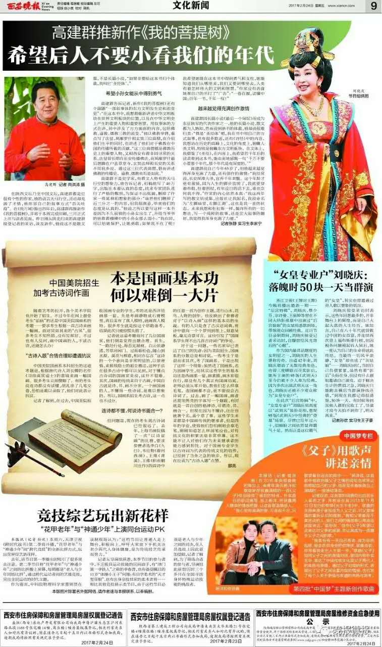 人文公司经理、著名作家高建群在《统万城》推出四年后,新作《我的菩提树》将于今年三月正式与读者见面。《西安晚报》专程采访高建群,畅谈新作品的创作内容与风格,于2017年2月24日在《西安晚报》9版发表文章《高建群推新作< 我的菩提树> 希望后人不要小看我们的年代》,现将全文转载如下: