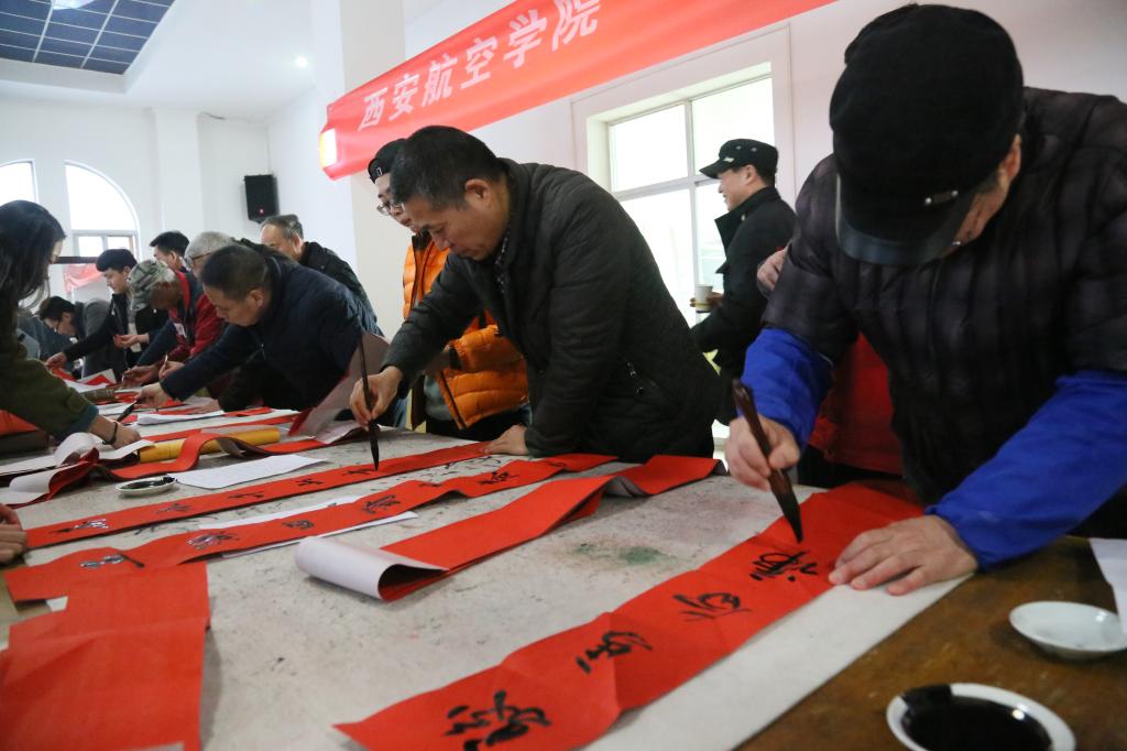 活动前期,人文公司购置了笔墨纸砚等物品,提前布置现场,为开展活动做好充分准备。春联义写现场,来自校内外的8位书画家和书法爱好者一字排开,他们各自发挥所长,应师生要求,挥毫泼墨,书写祝福。一幅幅行云流水、刚劲大方的春联,赢得围观师生的交口称赞和争相索要。对联的内容风格多样,丰富多彩,“雄鸡唱晓新春到,喜鹊登枝幸福来”、“朝阳晨露雄鸡唱,瑞气春花紫燕飞”、“梅花吐艳新春丽,鸡韵成歌盛世长”……让广大师生提前感受到了节日气氛。