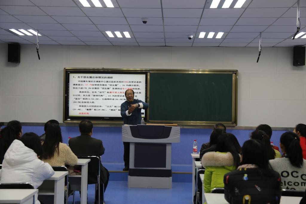 郭勇在课堂上首先回顾了上节课内容,随后从朋友圈的阅读情况、阅读的境界与反思、习近平的读书观、经典阅读这四节内容展开讲授。郭勇以中华书局推荐的国民经典100本书目为例,向同学们解读了经典阅读的含义,并以自己调研课题的实际经验讲述了朋友圈阅读的局限性和弊端,同时以习近平“爱读书、读好书、善读书”的阅读观引导大家要珍惜时光,养成良好的阅读习惯。