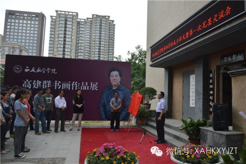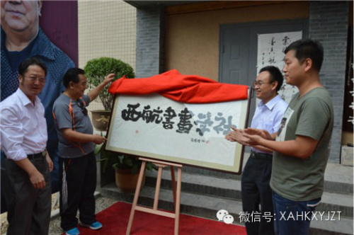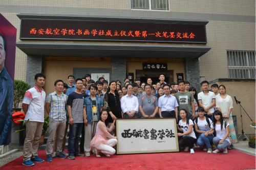 文公司副经理刘华阳宣布书画学社成立。文公司经理、著名作家高建群,校工会主席罗增强,校团委副书记张赛,书法名家石夫强共同为书画学社揭牌。石夫强老师特意为书画学社的成立题词“棠棣之花花开有家,墨香航院木秀林嘉”。
