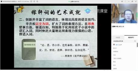 线上教学活动拟定于每周一、三、五进行,为期一个月。内容包括竞赛宣讲、文学讲座、文创艺术等等丰富内容。本周已完成第一次双创双沙龙讲座《第三届全国创意写作大赛宣讲》、专业讲座《辛弃疾诗词创作与爱国主义》。全体教师利用已经建成的SPOC、MOOC及其他线上课程资源,借助腾讯课堂、腾讯会议等平台,结合隔离员工实际情况,精心确定讲座主题,设计讲座内容,师生共同学习交流,有助于同学们拓展知识、强化疫情防控意识、充实隔离生活。