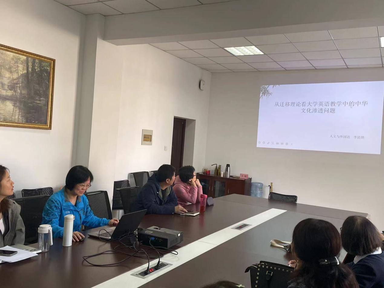2023年10月13日上午,大学英语第一教研室召开了教学研讨会。会议由教研室主任王军主持,会上李清艳副教授做了题为“从迁移理论看大学英语教学中的中华文化渗透问题”的讲座,教研室全体教师参与。