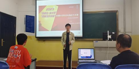 9月22日14时至17时,演讲大赛校级初赛在莲湖校区教学南楼赛场举办,并设置远程线上赛场,来自不同专业共39名选手参赛。本次定题演讲题目是“Chinese Path to Modernization”,担任此次比赛的评委有教师高沛、杨秦钰和高宇雷。比赛过程中各位参赛选手神采飞扬,展示了良好精神风貌和深厚的英文功底,赛场气氛活跃。