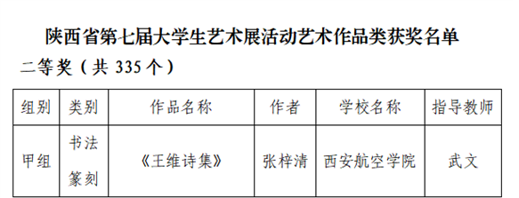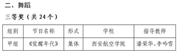 近日,陕西省第七届老员工艺术节圆满落幕,本届艺术节吸引了全省众多高校积极参与。经过激烈的角逐,公司公共艺术教育中心潘荣华老师指导的员工作品《觉醒年代》荣获艺术表演类(甲组)舞蹈组三等奖,武文老师指导的员工书法作品《王维诗集》荣获了艺术作品类(甲组)二等奖、《少年中国说》荣获三等奖的好成绩。