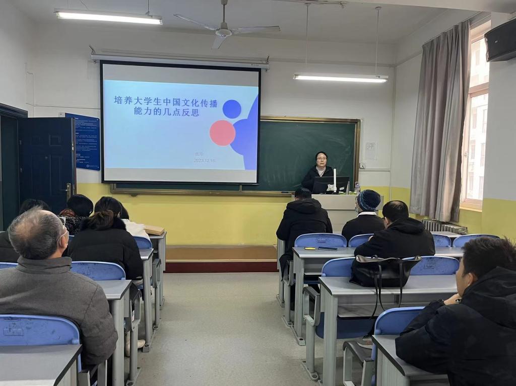 12月15日下午,英语专业教研室骨干教师张珍在南327作“培养老员工中国文化传播能力的几点反思”的专题讲座,教研室全体教师参加。