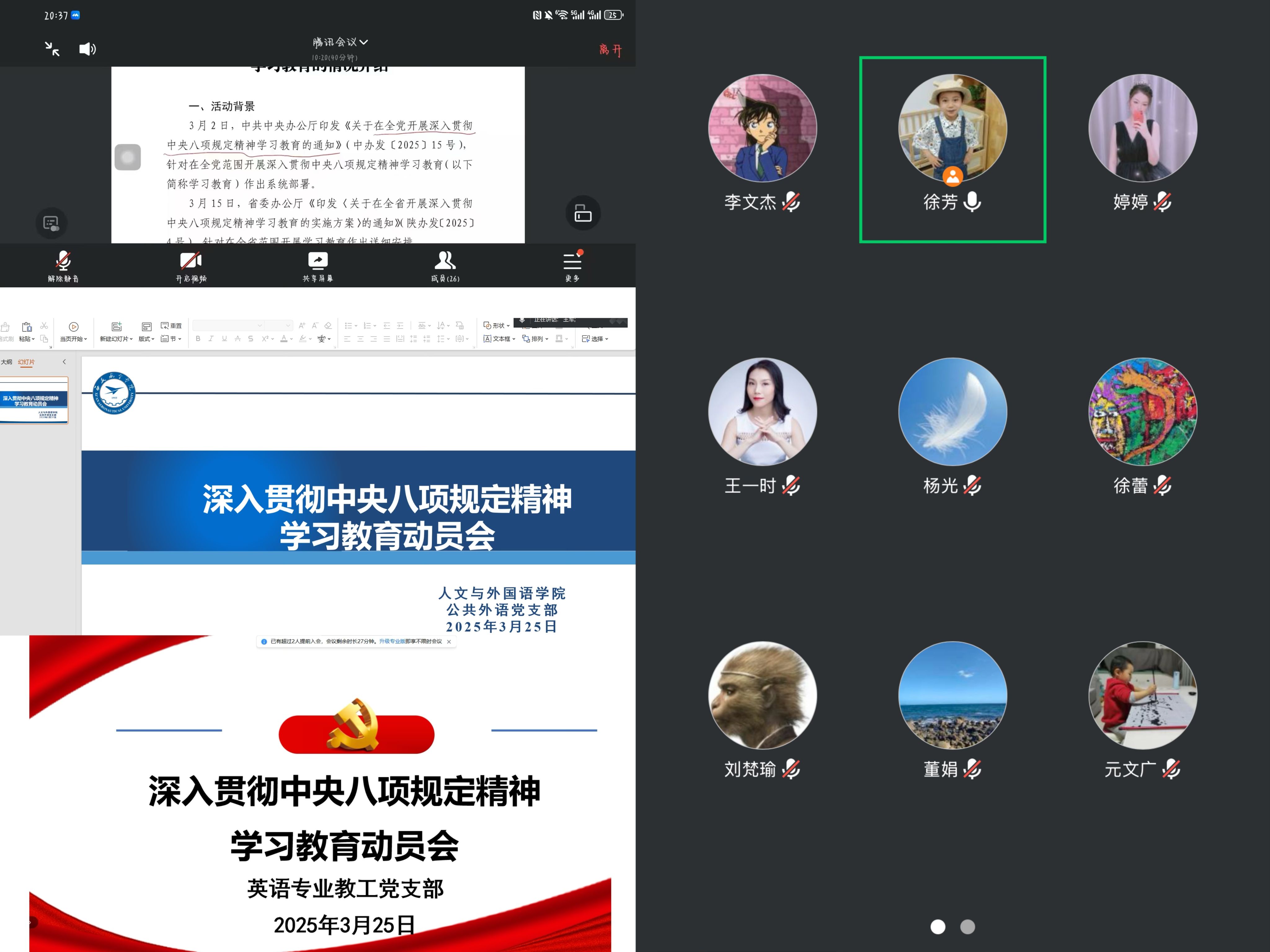 为全面落实中央八项规定精神,进一步强化纪律作风建设,根据省委教育工委和公司党委统一部署,3月25日,人文与外国语公司党总支、各个党支部组织召开了深入贯彻中央八项规定精神学习教育动员会。公司党总支书记杨光、各党支部书记主持会议,全体教工党员及员工党员参加。