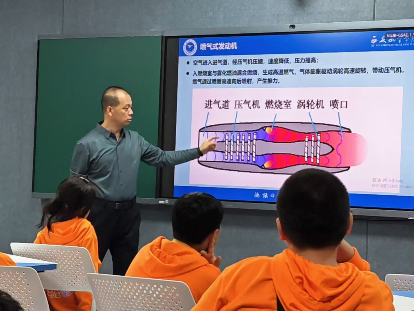 在航空工程实验教学示范中心,孩子们近距离观摩了飞机与发动机实物,并通过飞行器公司党总支书记刘建强的讲座《神奇的飞行》了解了航空航天的基础知识和喷气式发动机原理等。