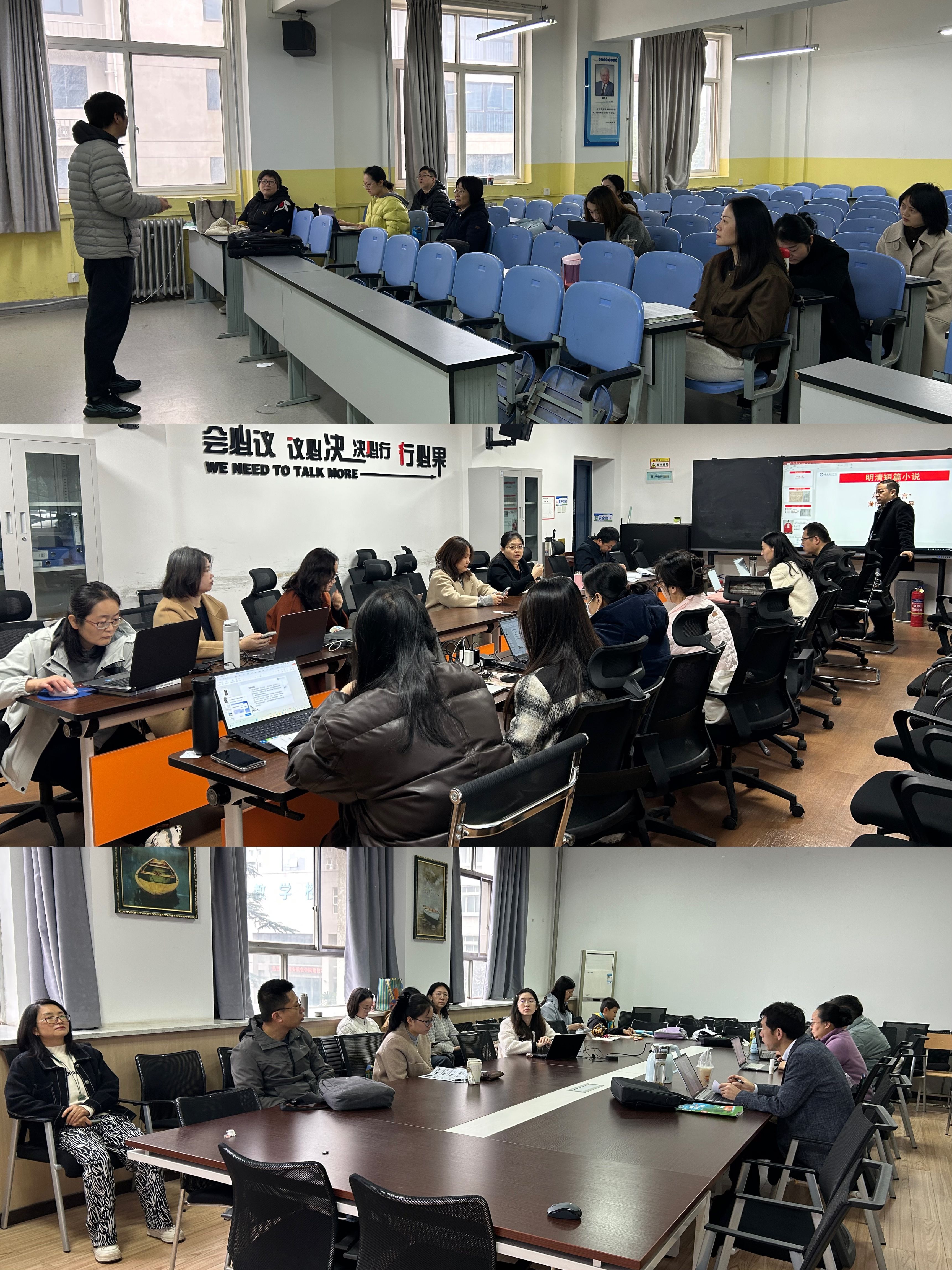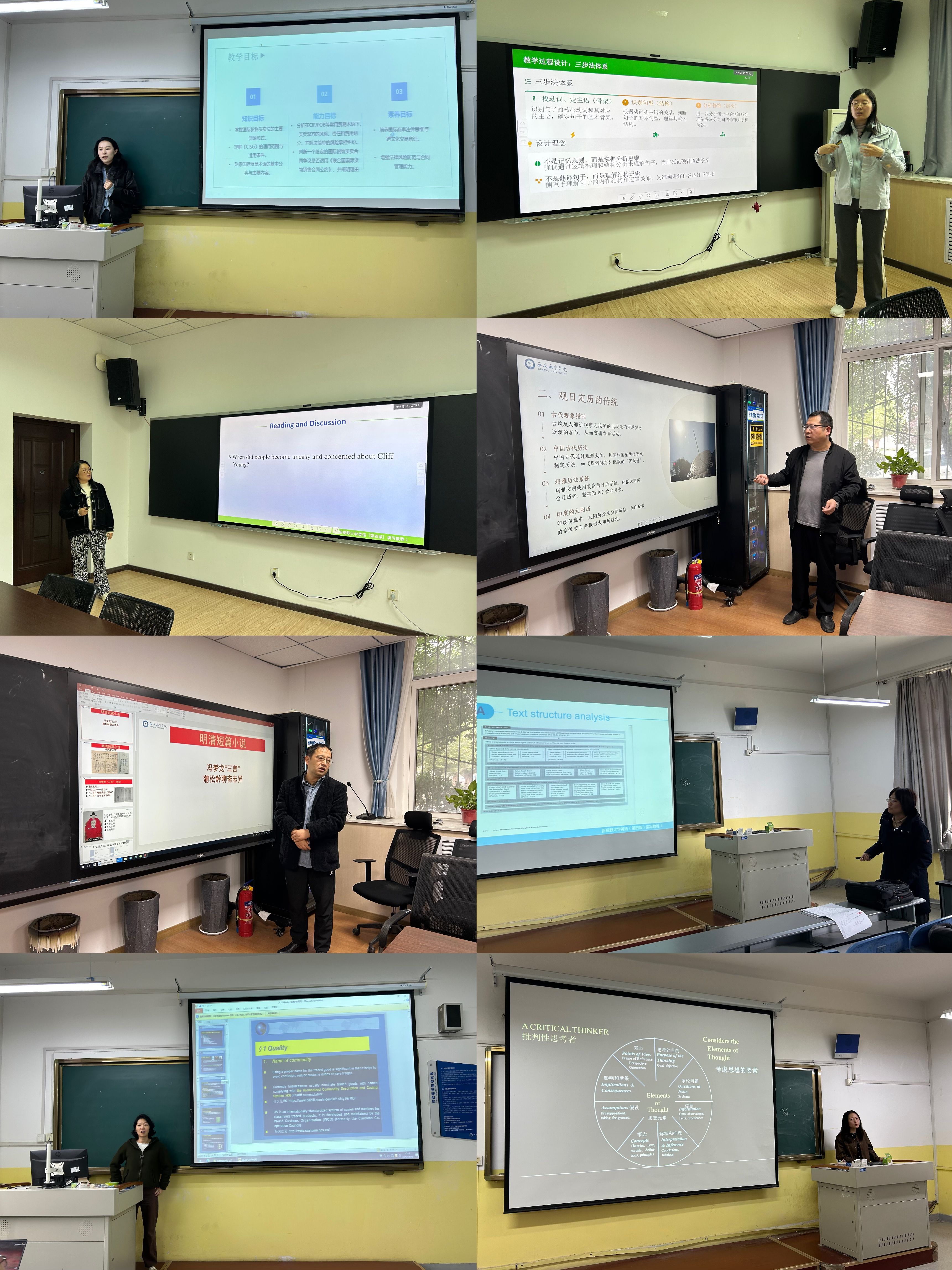 全体教师首先阐述了教授课程的教学设计总体思路与OBE理念的落实情况;随后进行了15分钟现场教学展示,重点包括教态教风、课程思政元素的有机融入与育人目标体现、教学创新点等。磨课结束后,教师们围绕课程思政融入程度、教学环节衔接、信息化工具使用效果等方面进行研讨交流,提出建议和期望,促进教学方案的持续完善。