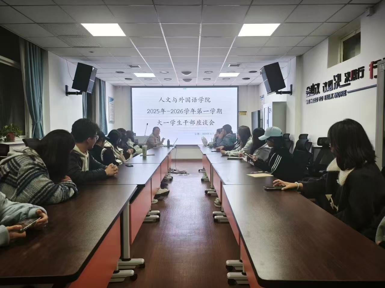 随后,辅导员杨秦钰以“班委的角色与责任”为核心展开专题分享。她结合“班级活动组织流程”“同学需求收集与反馈机制”“学风建设具体推动方法”等实际案例,让班委们对团学工作有了更明确的认知。