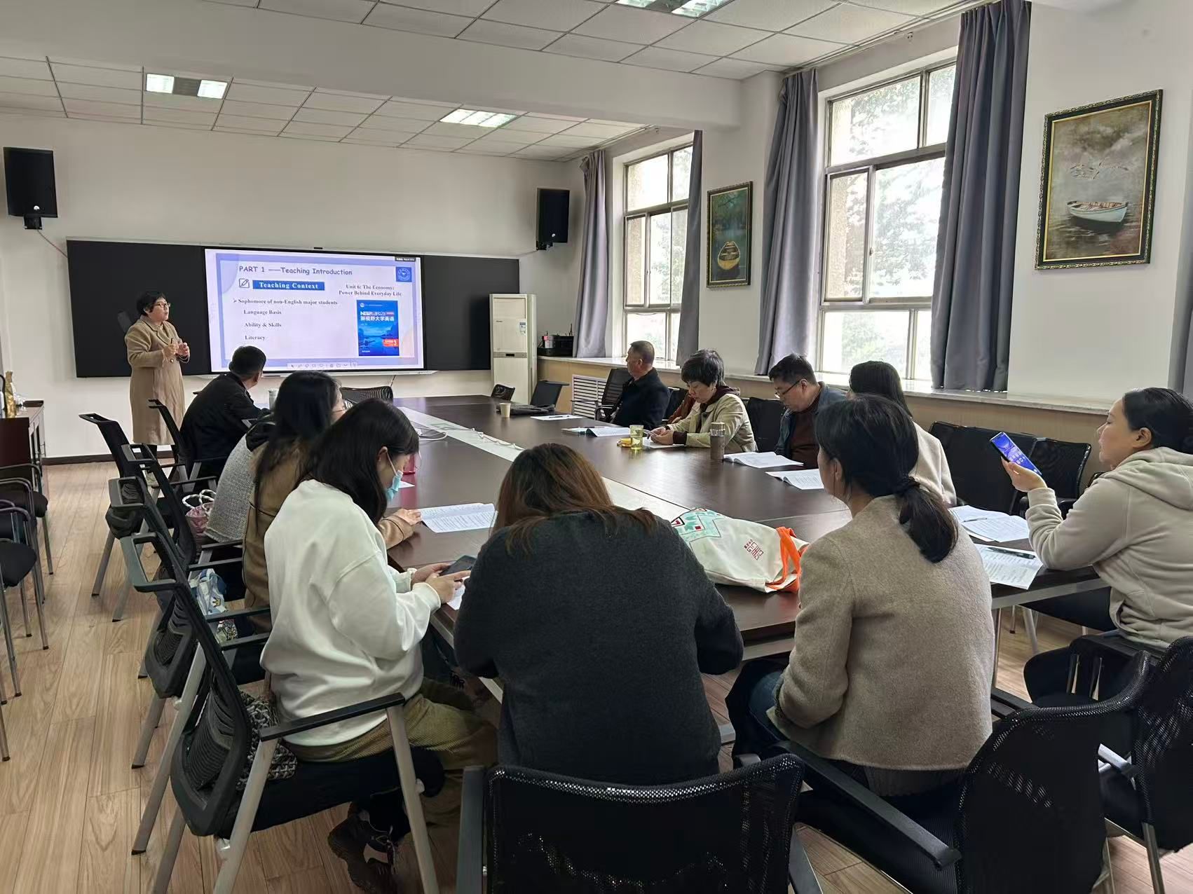 在研讨会期间,褚喜之就基于OBE理念的大学英语教学模式做了介绍,其就OBE教学理念的指导原则、大学英语实用的教学方法、教学设计以及教学方法在课堂教学环节中的运用进行了解说,并进行了课堂展示。