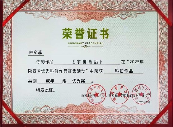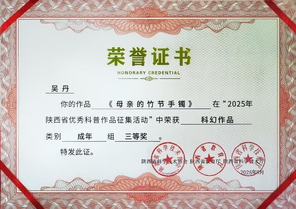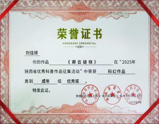 日前,由陕西省科协、陕西省教育厅、陕西省科技厅联合开展的2025年陕西省优秀科普作品征集活动公布评选结果。此次活动经组织申报、分类初选、终审公示等环节,最终,公司教师吴丹的科幻作品《母亲的竹节手镯》获三等奖;陆奕菲的科幻作品《宇宙背后》获优秀奖(指导教师:吴丹),刘佳琦的科幻作品《卿云破晓》获优秀奖(指导教师:吴丹)。