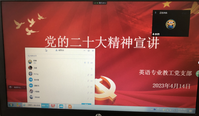 2023年4月14日下午,英语专业教工党支部全体党员在支部书记张雷刚的带领下,通过腾讯会议与线下现场会议相结合的形式,继续深入学习二十大精神。