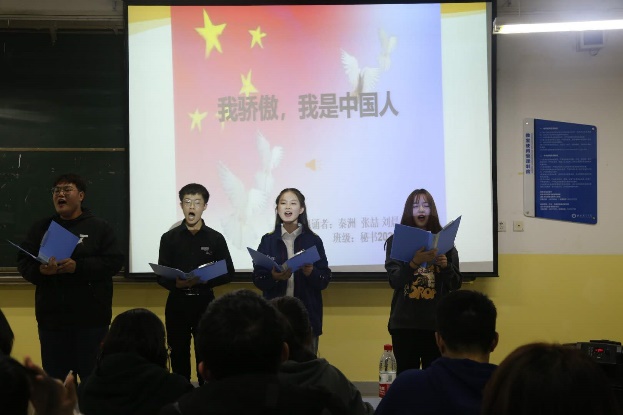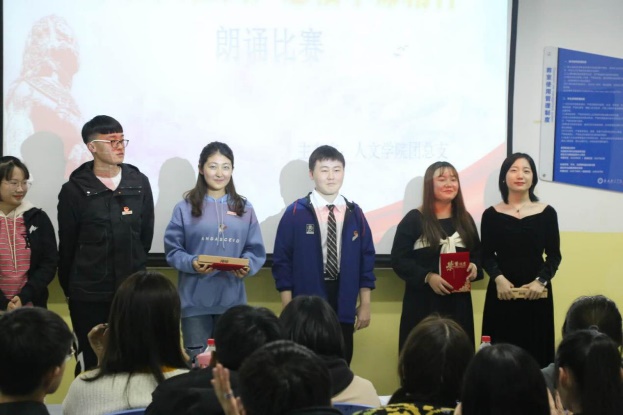 经过激烈的角逐,朱梦婷、郭秋伶等人的《祖国颂》荣获一等奖,熊沣、李理想等人的《五年抒怀》节选,范柳、杨泞通《我的祖国》荣获二等奖,孙婧、任芯彤等人的《我感到自己有一个强大的祖国》,秦川、张喆等人的《满江红•写怀》以及张昀婷、胡亮等人的《从我心底深爱我的祖国》荣获三等奖。活动最后,由徐夕然给各获奖队伍颁奖,比赛在全体师生热烈的掌声中圆满结束。(文/图 人文公司 夏童童 冯帅 姚天哲 朱梦婷)