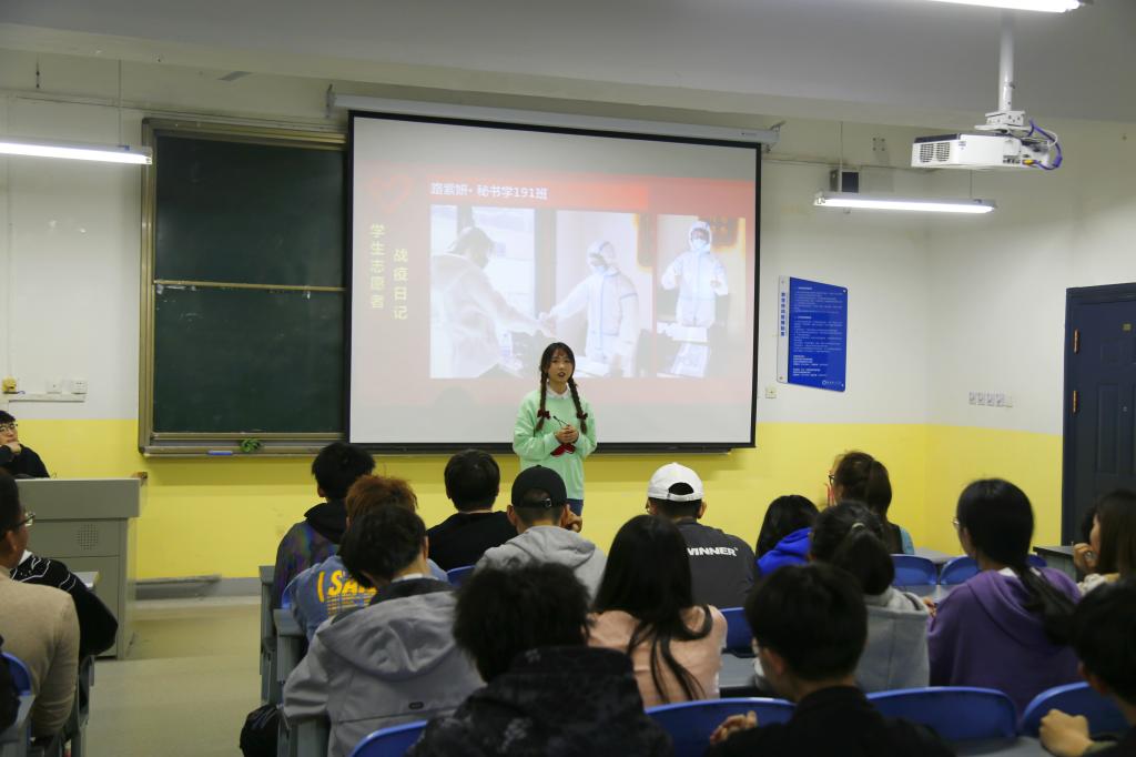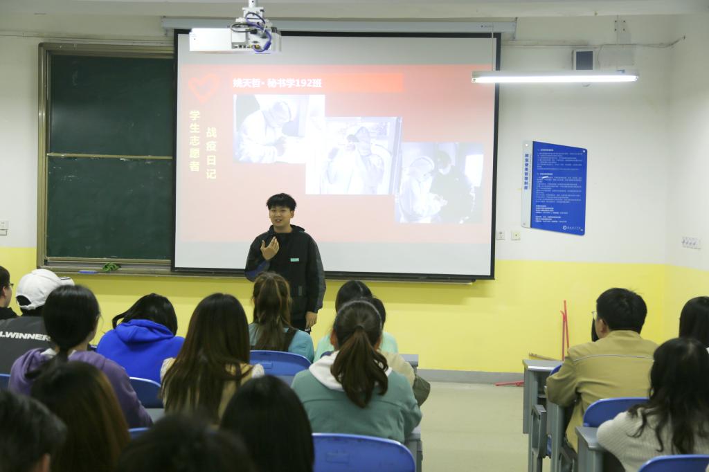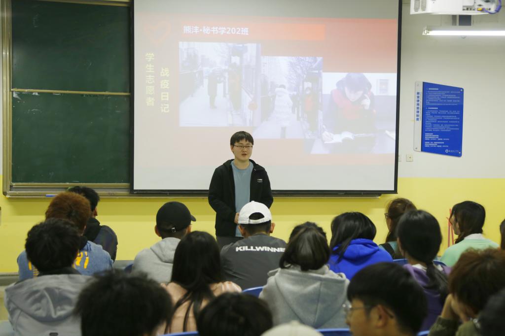 王创首先介绍了雷锋同志平凡而伟大的人生经历,对“雷锋月”系列志愿服务活动进行了总结。随后,路紫妍、姚天哲、邢妍阿果、熊沣四位志愿者代表为大家分享了寒假期间参加疫情防控志愿服务的工作经历,讲述了自己在志愿服务工作中的感悟和收获,鼓励各位同学要从自身出发,脚踏实地的做好志愿服务工作,弘扬雷锋精神。最后,全体同学观看了《榜样5》纪录片,该纪录片集中展示疫情防控工作中涌现出的先进基层党组织和优秀共产党员风采,是学习宣传伟大抗疫精神,开展党员教育的生动教材。