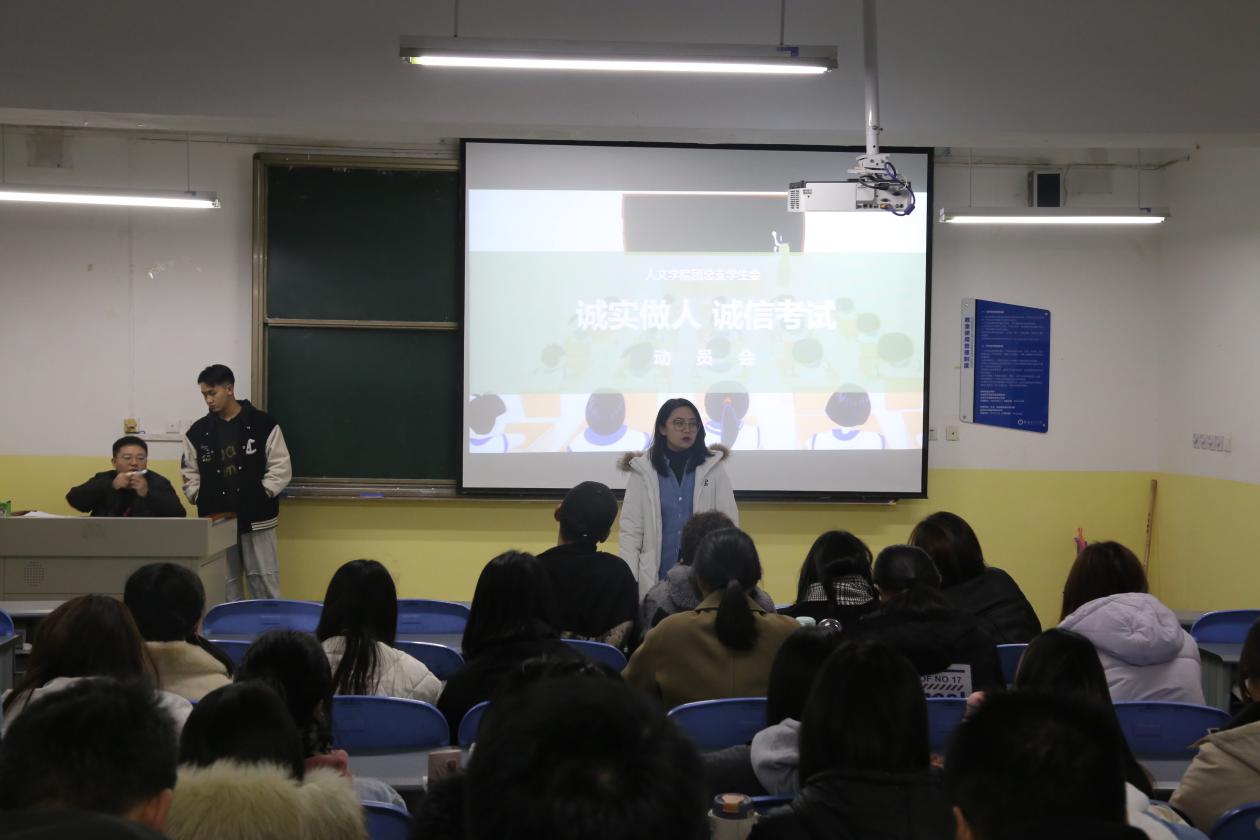 为树立员工诚信为本的道德理念,进一步加强考风建设、严肃考试纪律、规范考试秩序,端正学习态度,维护考试的公平、公正,营造积极进取的复习氛围。人文公司于11月30日19点在南楼107教室召开“诚实做人,诚信考试”的动员会。本次动员会由李梦阳主持,人文公司辅导员徐夕然及全体团学干部参加。