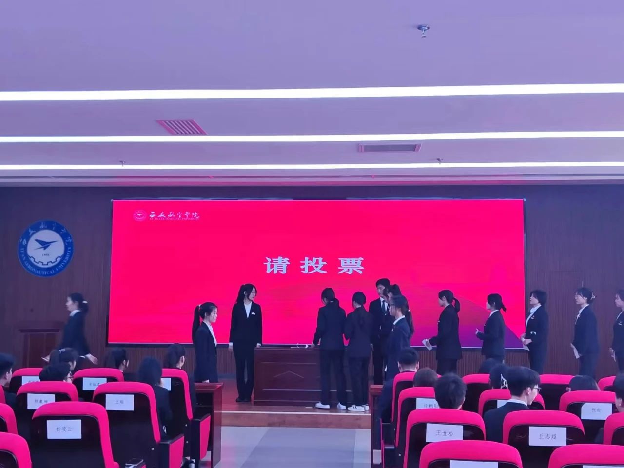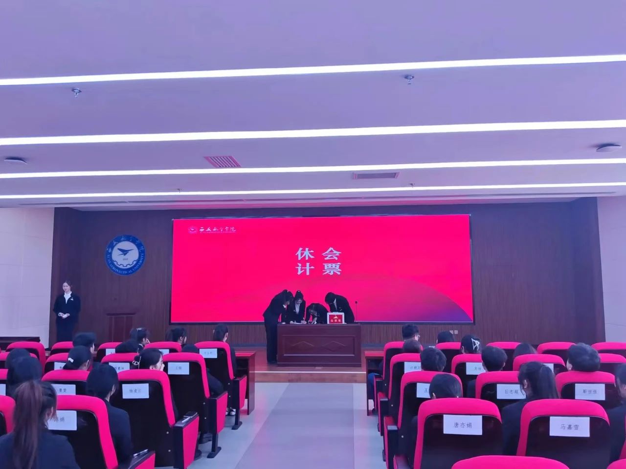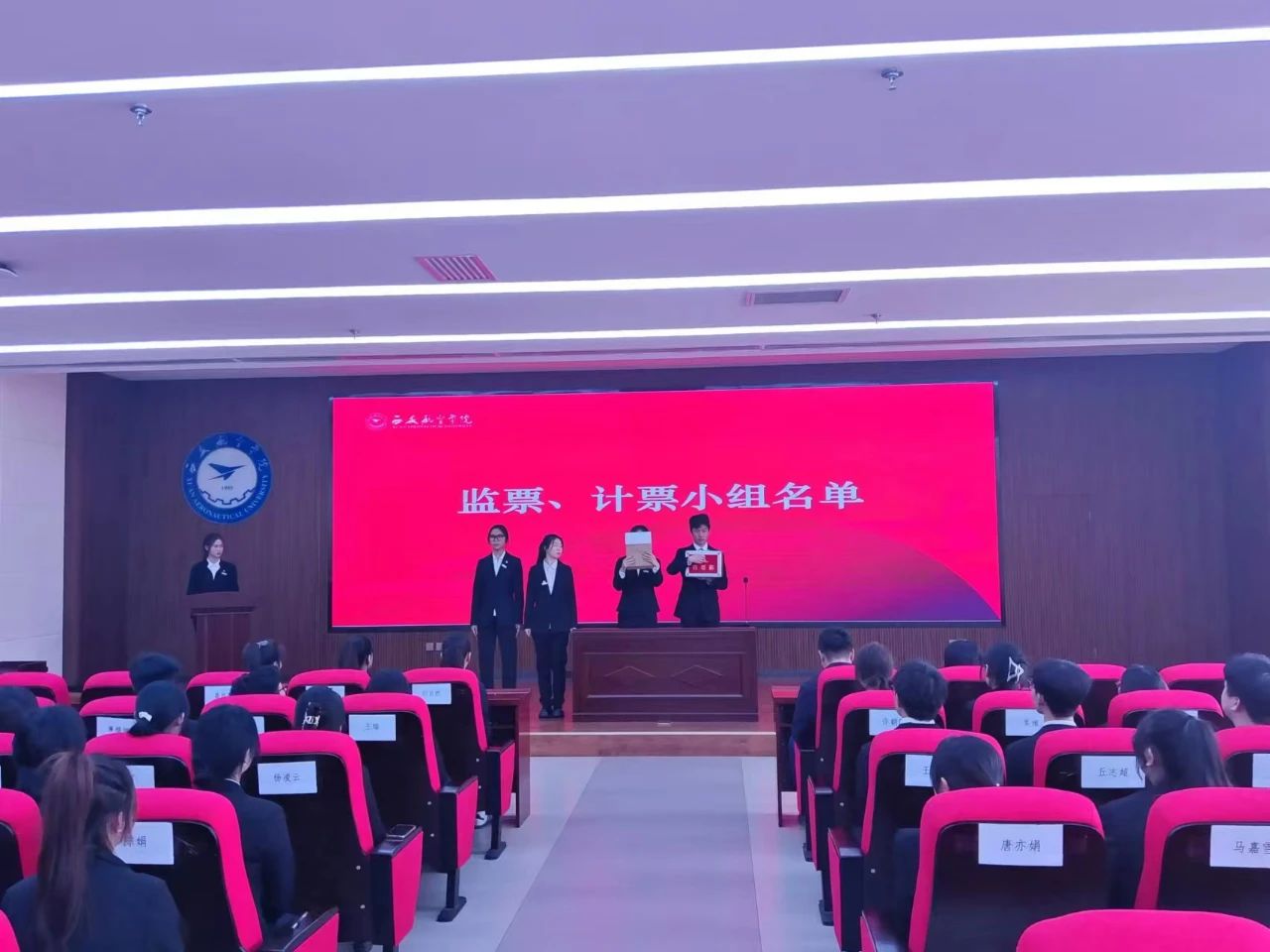 主持人宣读了监票小组名单,计票人:郭淑佩,董若涵;监票人:杜兰汀,李昕怡。在各位代表的监督下,检查投票箱并开封选票。