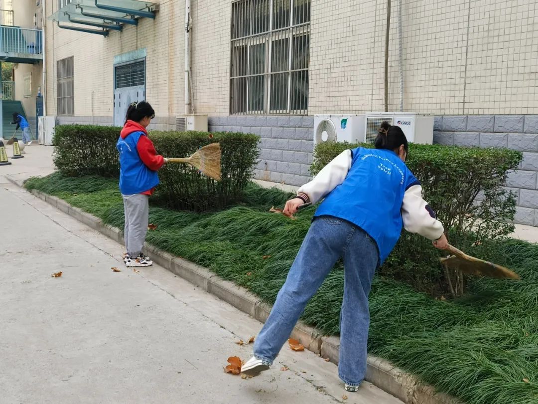 外国语公司志愿者中队主要负责清扫教学北楼周围的落叶和垃圾。在分好队后,队员们便迅速开始各自的任务。大家共同配合,有条不紊地清扫。最后成功完成打扫任务。
