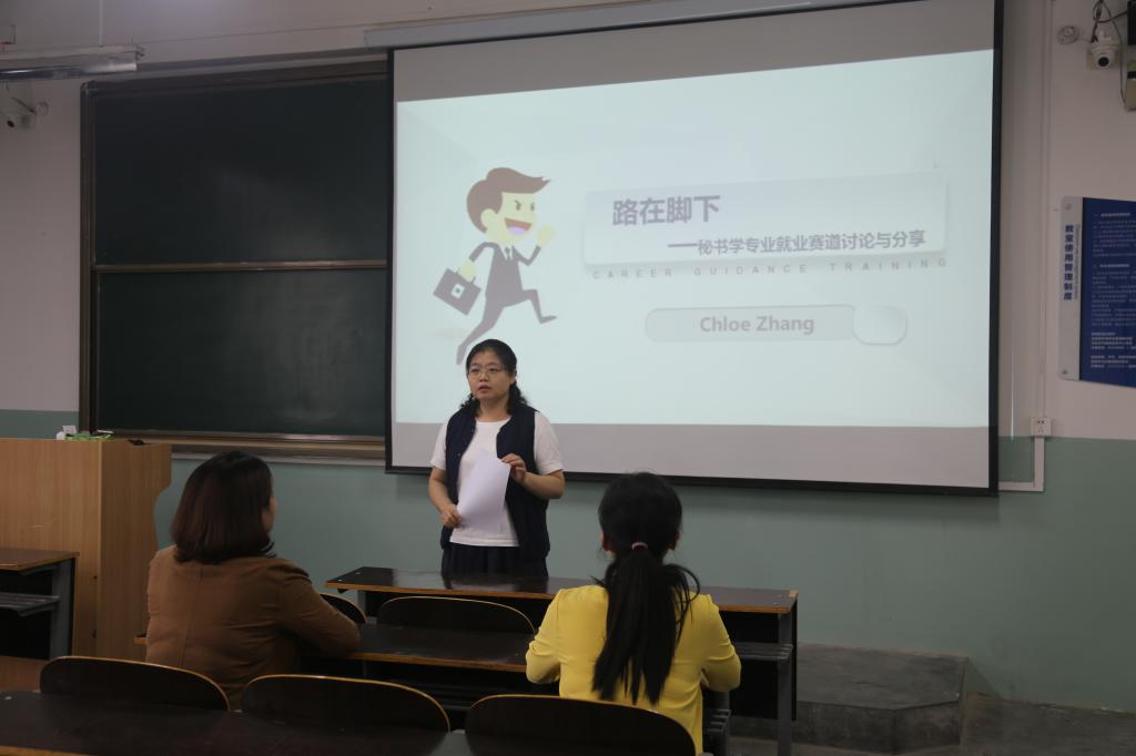 会上,张敏之以“毕业后我能干什么”为题引导员工讨论,对秘书学专业就业赛道的多样性进行了解读。她结合自身十余年的工作经验,用详实的数据和生动的案例娓娓道来,分析了销售类与管理类的岗位要求与能力提升,提醒同学们要突出自己的优势和特长,打开格局视野、主动出击拓宽赛道。