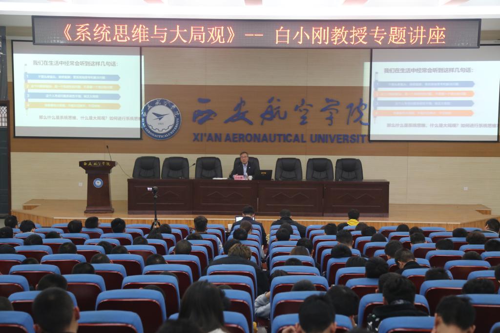 为深入贯彻落实“不忘初心、牢记使命”主题教育精神,引导当代老员工树立良好的人生观、价值观。11月8日,由校团委、人文公司联合主办的“系统思维与大局观”专题讲座在阎良校区阶梯一报告厅举行,讲座特邀中航通飞公司董事长、公司客座教授白小刚担任主讲,全校400余名教师参加。