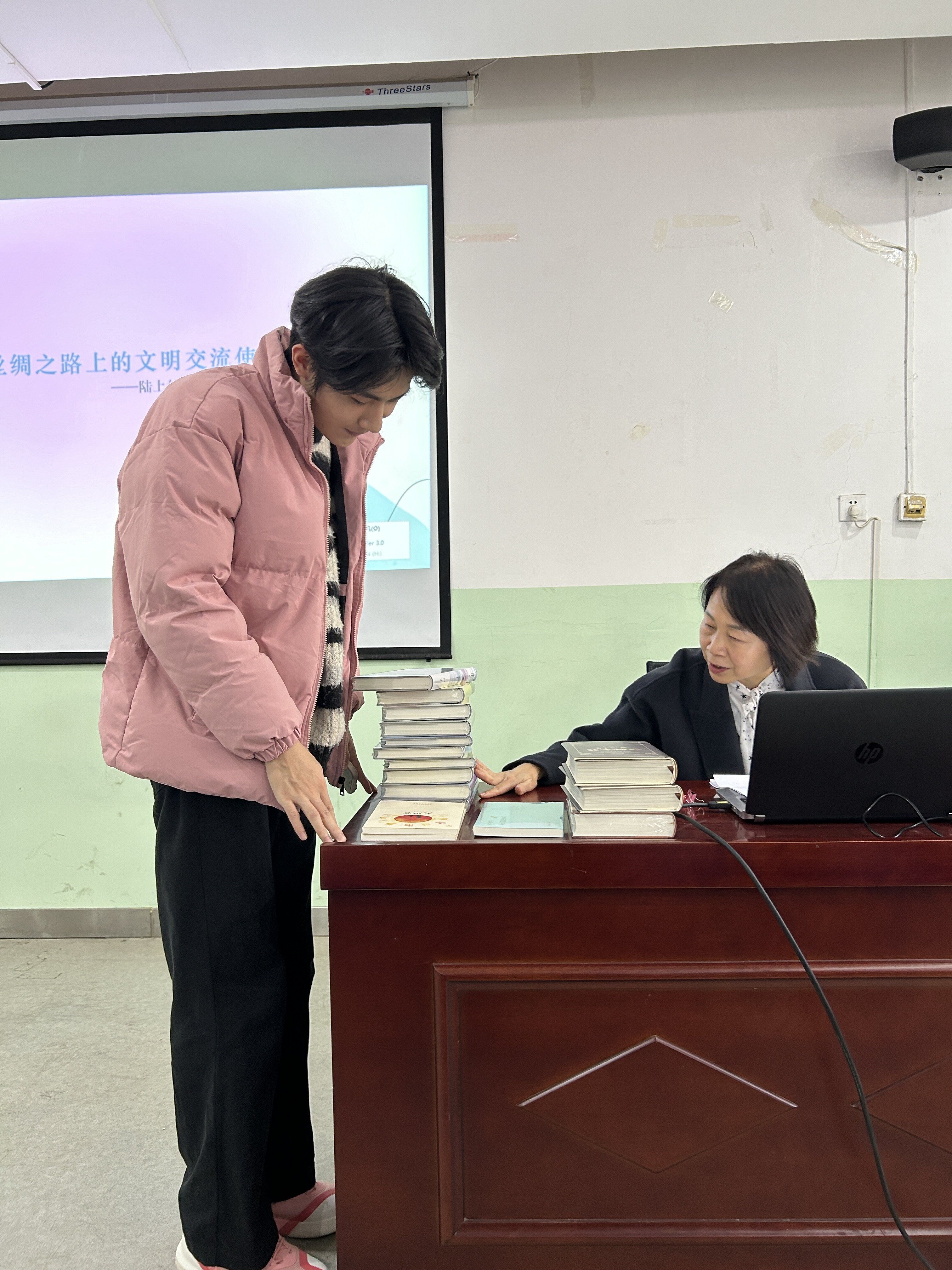 韩霁虹首先介绍了丝绸之路的含义、“一带一路”的构建重点,指出了文化交流的重要性。讲述了古代丝绸之路上文明交流使者——霍去病、班超、甘英、郑和的故事,他们推动了内地和西域的直接交往,为丝绸之路的进一步拓展奠定基础。随后,韩霁虹讲解了“一带一路”上文化交流的相关组织平台、活动和成果,它们加深了沿线各国间的经济往来,加强了文化间的良性互动,推动了中国文化走向世界。讲座中,韩霁虹与现场师生展开互动,交流讨论并赠予图书,氛围热烈。