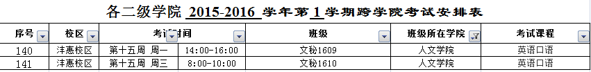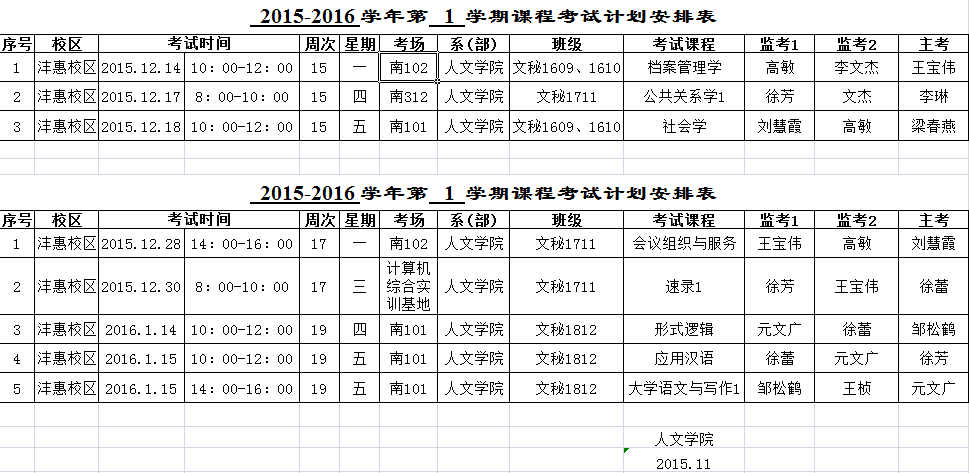 人文公司2015-2016学年第1学期课程考试计划安排