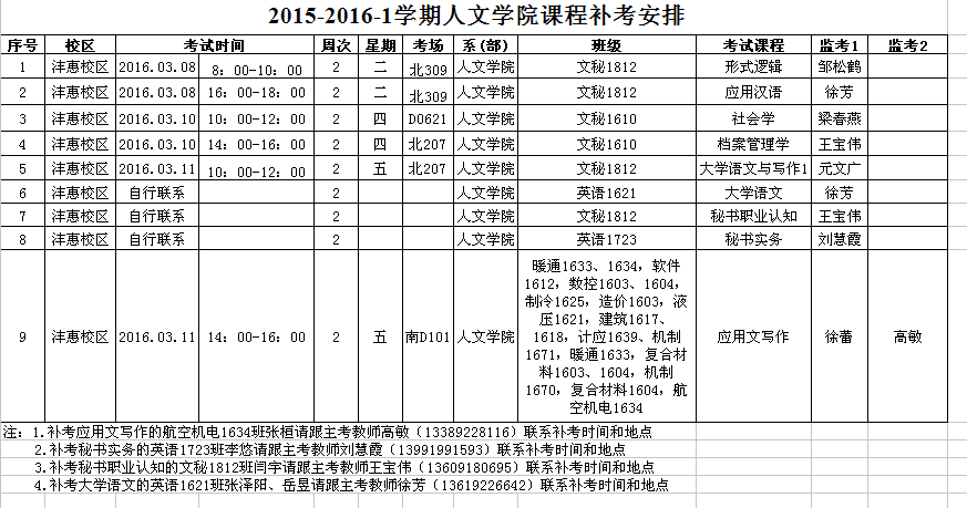 按照公司要求,人文公司2015-2016-1学期课程补考安排如下表。参加补考人员名单详见附件。请各位同学及时查看下载,主动联系相关负责教师,按时参加补考,遵守考场纪律。